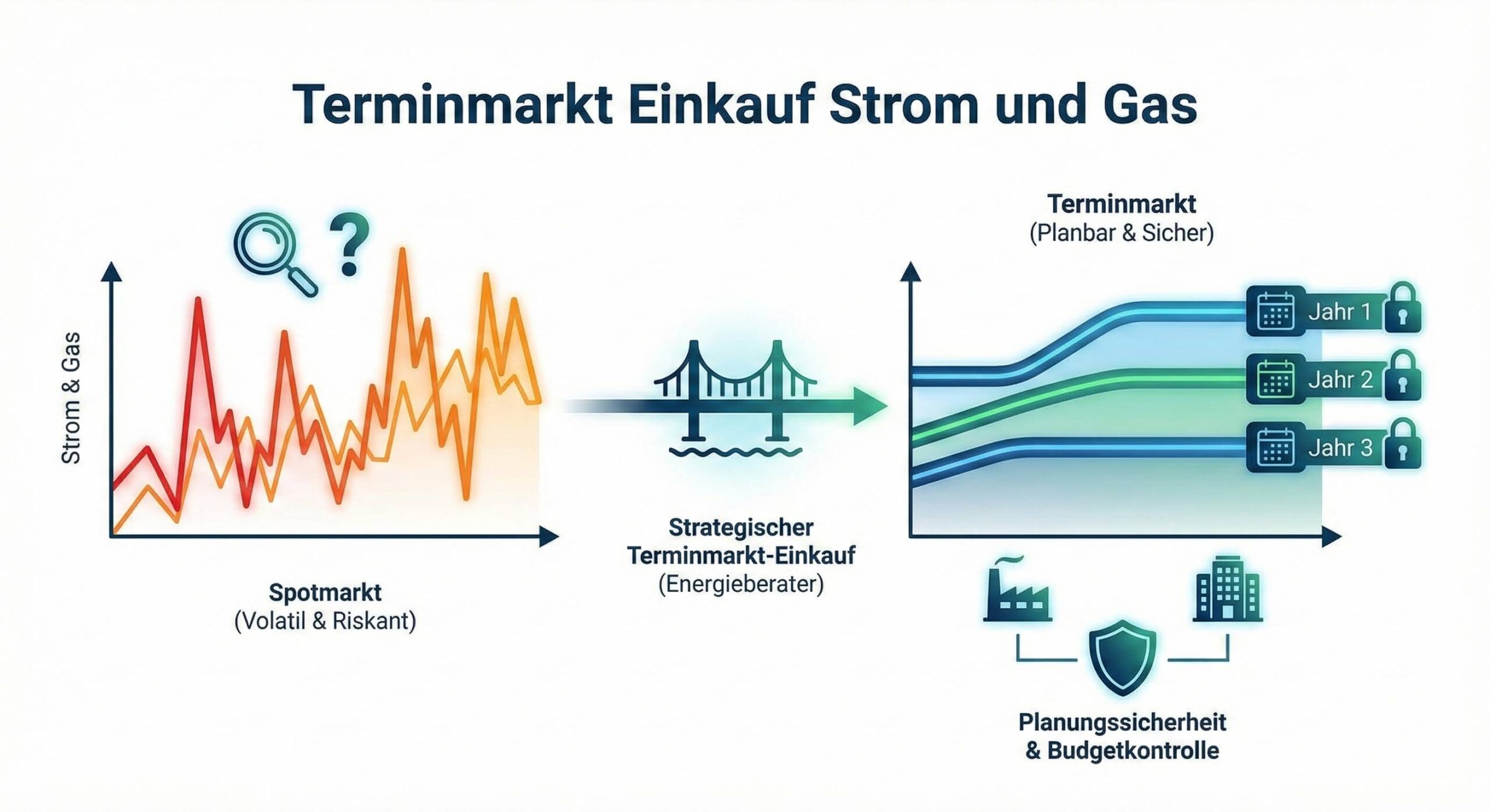 Während der Spotmarkt (kurzfristiger Einkauf) oft durch extreme Preisausschläge geprägt ist, erlaubt der Terminmarkt eine strukturierte Absicherung.